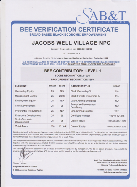 BEE scores are a reality in the South African business world. Your BEE scores can be greatly improved when you support or partner with Jacobs Well NPC (BBB-EE Level 1, 135% Procurement) in the following areas: